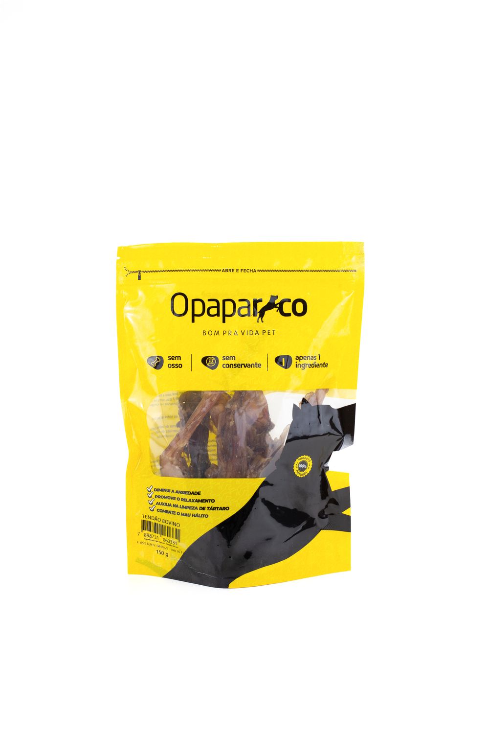 Elaborado com apenas 1 ingrediente, o Tendão Bovino Natural OPaparico é um petisco mastigável 100% natural, livre de ossos e conservantes, garantindo uma opção saudável e segura para o seu amigo de quatro patas. Sua textura fibrosa e sabor irresistível são perfeitos para diminuir a ansiedade e promover o relaxamento, enquanto a mastigação intensa auxilia na limpeza de tártaro e combate o mau hálito. A embalagem prática tipo stand-up pouch com fechamento zip lock assegura a frescura e a qualidade do produto, com uma janela transparente que permite visualizar os petiscos de coloração marrom-avermelhada. Escolha OPaparico para proporcionar uma vida pet mais feliz e saudável.